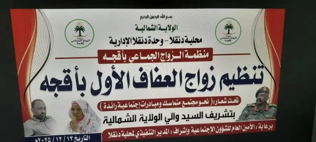 تحتفل محلية دنقلا بالزواج الجماعي الأول في منطقة أقجة والذي يجئ تحت شعار (نحو مجتمع متماسك ومبادرات إجتماعية رائدة) ، حيث يشرف المناسبة والي الشمالية عبد الرحمن عبد الحميد وذلك في يوم السبت 13 ديسمبر الجاري.