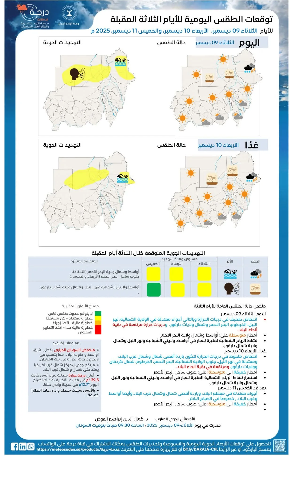 توقعت الهيئة العامة للأرصاد الجوية انخفاض طفيف في درجات الحرارة مساء اليوم الثلاثاء مع أجواء معتدلة في (الولاية الشمالية، نهر النيل، الخرطوم، البحر الاحمر) ودرجات حرارة مرتفعة في بقية أنحاء البلاد مع هطول أمطار متوسطة على (أواسط وشمال ولاية البحر الاحمر) ، ونشاط الرياح الشمالية لمثيرة للغبار في (أواسط ولايتي الشمالية ونهر النيل) ، وأشارت الهيئة في نشرتها الخاصة بالأحوال الجوية لانخفاض ملحوظ في درجات الحرارة يوم غد الأربعاء لتكون باردة (أقصى شمال وشمال غرب البلاد) ، ومعتدلة في نهر (النيل، جنوب الولاية الشمالية، البحر الأحمر، الخرطوم، شمال كردفان وولايات دارفور) ، ومرتفعة في بقية انحاء البلاد، مع هطول أمطار خفيفة الي متوسطة على جنوب (ساحل البحر الأحمر) يصاحبها نشاط الرياح الشمالية المثيرة للغبار في (أواسط ولايتي الشمالية ونهر النيل وشمال) ، وأضافت الهيئة في نشرتها حول طقس يوم الخميس المقبل أن تسود أجواء معتدلة في معظم البلاد، وباردة (أقصى شمال وشمال غرب البلاد) وأيضا (أواسط وغرب البلاد) ، خصوصاً في الصباح الباكر، مع أمطار خفيفة الي متوسطة على (جنوب ساحل البحر الأحمر) .