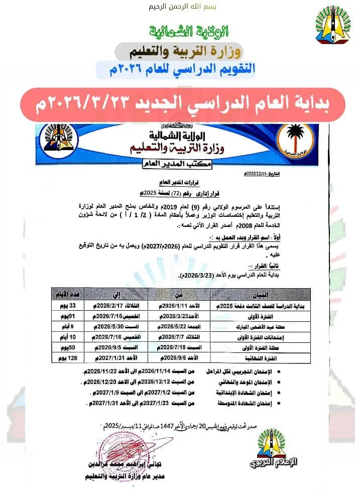 التربية والتعليم بالشمالية : 23 مارس المقبل بداية العام الدراسي الجديد 2026م