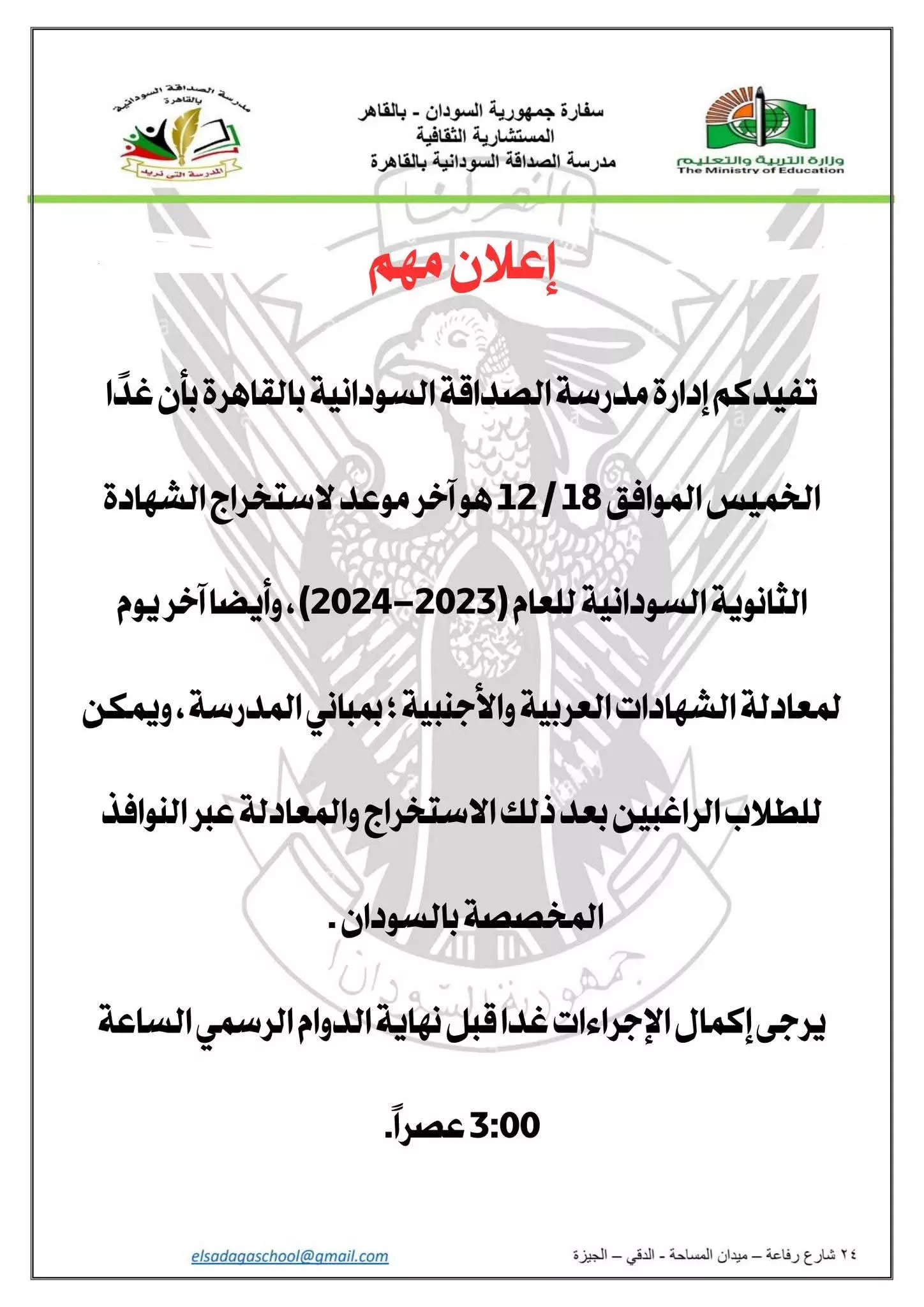 أعلنت إدارة مدرسة الصداقة السودانية بالقاهرة بأن غدًا الخميس الموافق 18ديسمبر هو آخر موعد لاستخراج الشهادة الثانوية السودانية للعام (2023–2024)م ، كما بعد آخر يوم لمعادلة الشهادات العربية والأجنبية بمباني المدرسة ، مؤكدة بأنه في إمكان الطلاب الراغبين بعد ذلك الاستخراج والمعادلة عبر النوافذ المخصصة بالسودان ونوهت لأهمية إكمال الإجراءات غدا الخميس قبل نهاية الدوام الرسمي الساعة 3:00 عصراً.