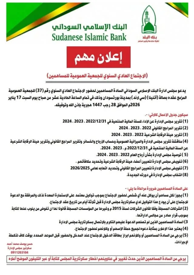 البنك الإسلامي السوداني يحدد 17 يناير موعداً لإنعقاد إجتماع الجمعية العمومية للمساهمين