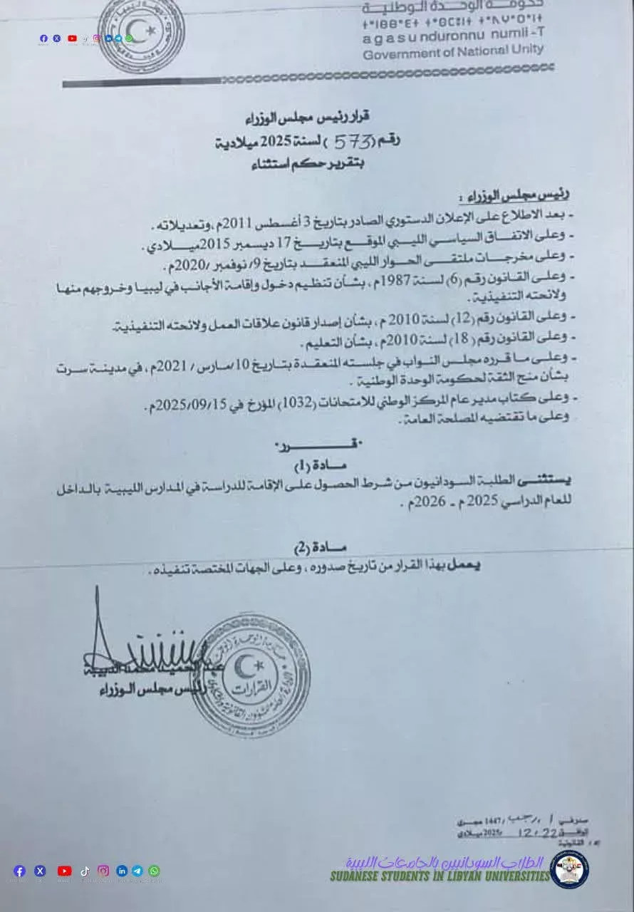 قالت السفارة السودانية في طرابلس ان حكومة الوحدة الوطنية في ليبيا قررت استثناء الطلاب السودانيين من شرط الحصول على الاقامة للدراسة بالمدارس الليبية للعام الدراسي 2025_2026م ، وقدمت السفارة شكرها لحكومة الوحدة الوطنية الليبية بقيادة رئيس الوزراء عبد الحميد الدبيبة على مواقفها النبيلة والمقدرة تجاه السودانيين الذين اضطرتهم ظروف الحرب اللجوء الي ليبيا .