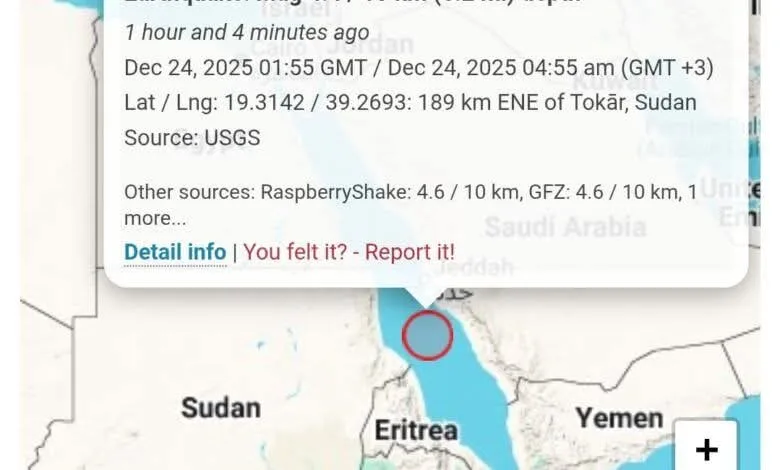 أعلن مركز رصد الزلازل عن وقوع هزة أرضية بقوة 4.4 درجة على مقياس ريختر، فجر اليوم الأربعاء 24 ديسمبر 2025، عند الساعة 04:55 صباحاً بتوقيت (غرينتش +3)، وذلك على بعد 189 كيلومتراً شمال شرق مدينة طوكر بولاية البحر الأحمر.