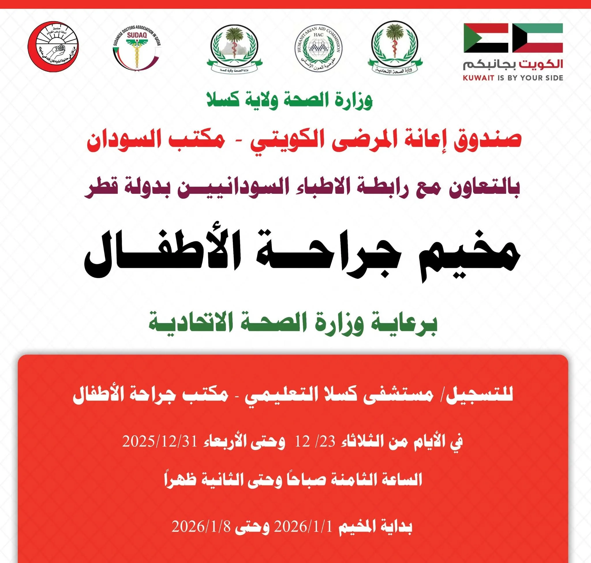 ينظم صندوق إعانة المرضي الكويتي فرع السودان مخيماً علاجياً لجراحة الأطفال وذلك بمستشفي كسلا التعليمي إعتباراً من مطلع العام المقبل ويستمر لمدة أسبوع، حيث بدأت إجراءات التسجيل منذ أول أمس الثلاثاء وتنتهي بالأربعاء 31 ديسمبر الجاري، ويجئ المخيم العلاجي بالتعاون مع رابطة الأطباء السودانيين بدولة قطر وبرعاية من وزارة الصحة الاتحادية .