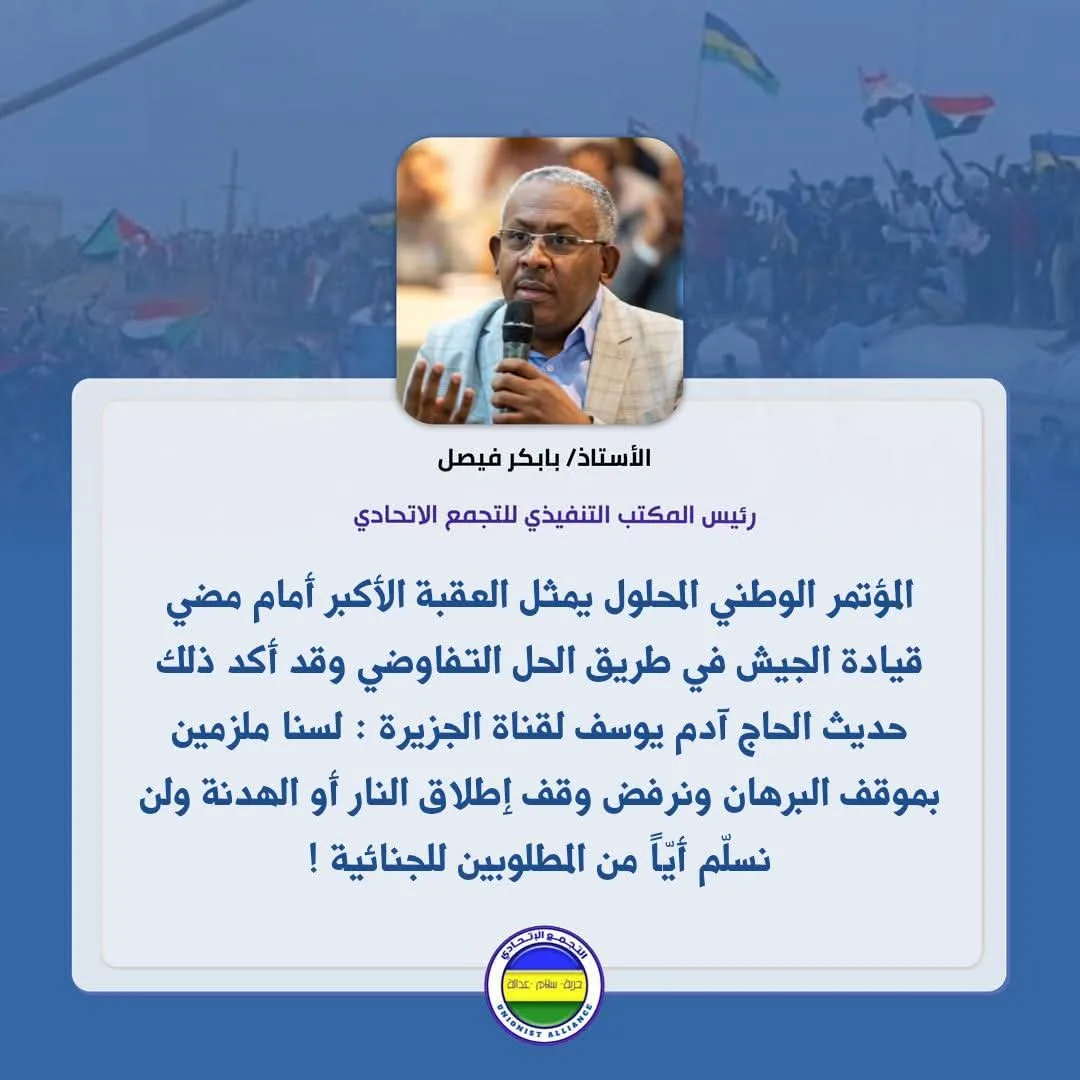 _ المؤتمر الوطني المحلول يمثل العقبة الأكبر أمام مضي قيادة الجيش في طريق الحل التفاوضي وقد أكد ذلك حديث الحاج آدم يوسف لقناة الجزيرة : لسنا ملزمين بموقف البرهان ونرفض وقف إطلاق النار أو الهدنة ولن نسلّم أيّاً من المطلوبين للجنائية !