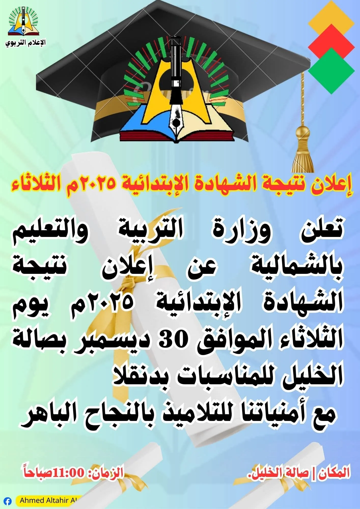 أعلنت وزارة التربية والتعليم بالولاية الشمالية عن موعد إعلان نتيجة الشهادة الابتدائية للعام 2025م، وذلك يوم الثلاثاء الموافق 30 ديسمبر بصالة الخليل بمدينة دنقلا، في تمام الساعة 11:00 صباحًا