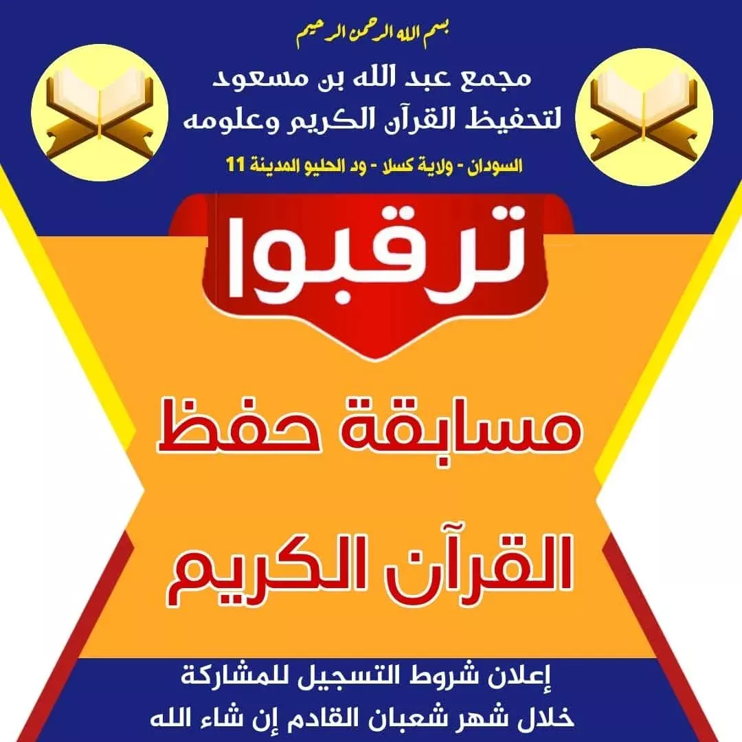 أعلن مجمع عبد الله بن مسعود لتحفيظ القرآن الكريم وعلومه بمنطقة ود الحليو المدينة 11 بولاية كسلا عن ترتيبات وتجهيزات تجري حالياً لمسابقة حفظ القرآن الكريم التي يشارك فيها عدد كبير من الحفظة ، حيث سيتم فتح باب إجراءات التسجيل وإعلان شروط المسابقة خلال شهر شعبان المقبل .