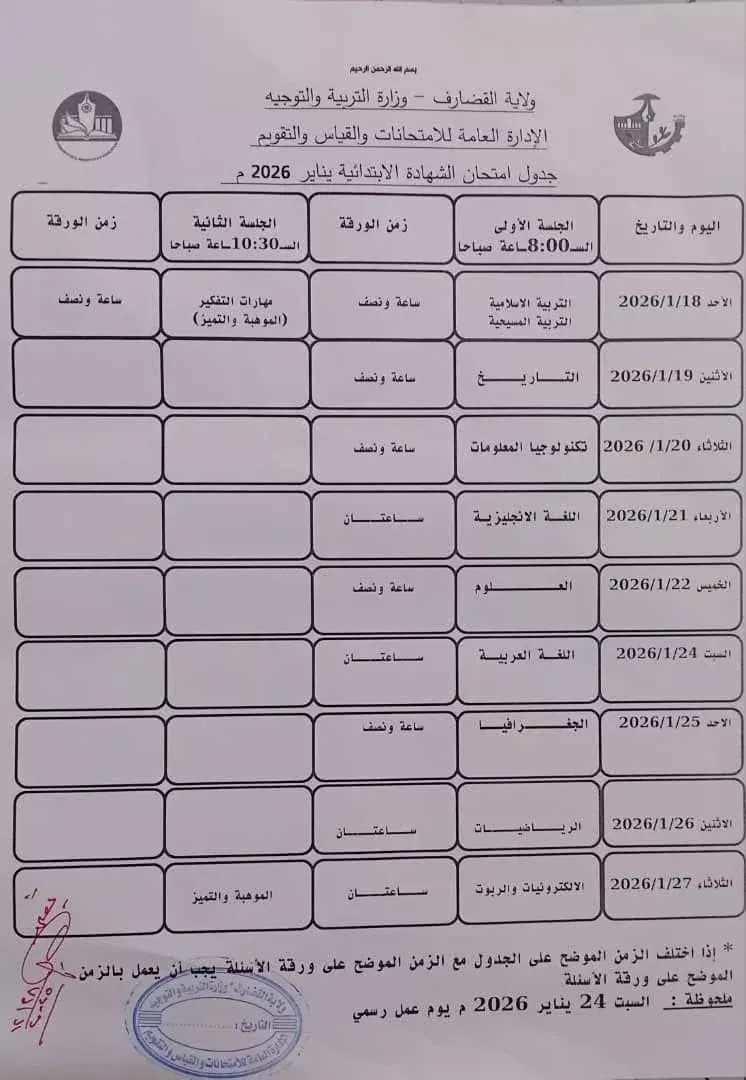 أعلنت وزارة التربية والتوجيه بولاية القضارف عن موعد جلوس الطلاب لامتحانات الشهادة الابتدائية في جميع محليات الولاية للعام 2026م ، ونشرت الوزارة جدول الإمتحانات وحددت يوم الأحد 18 يناير 2026م موعداً لبداية الإمتحانات علي أن تنتهي في يوم 27 من الشهر نفسه.