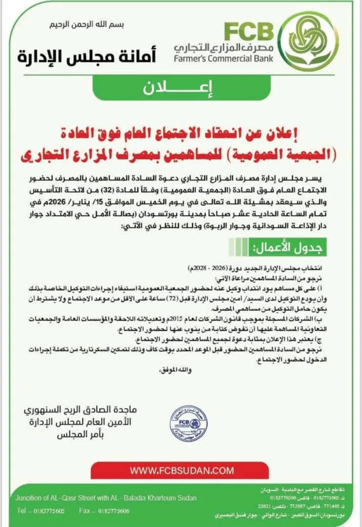 يسر مجلس إدارة مصرف المزارع التجاري دعوة السادة المساهمين بالمصرف لحضور الاجتماع العام فوق العادة (الجمعية العمومية) وفقاً للمادة (32) من لائحة التأسيس والذي سيعقد بمشيئة الله تعالى في يوم الخميس الموافق 15/ يناير/ 2026م في تمام الساعة الحادية عشر صباحاً بمدينة بورتسودان (بصالة الأمل حي الامتداد جوار دار الإذاعة السودانية وجوار الربوة) وذلك للنظر في الآتي: