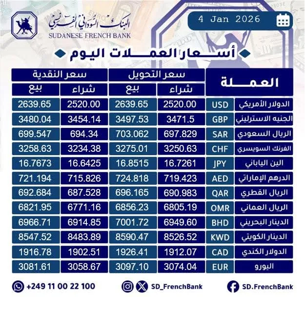 قائمة أسعار صرف العملات الأجنبية مقابل الجنيه السوداني من البنك السوداني الفرنسي اليوم الاحد الموافق 4/ يناير/2006م
