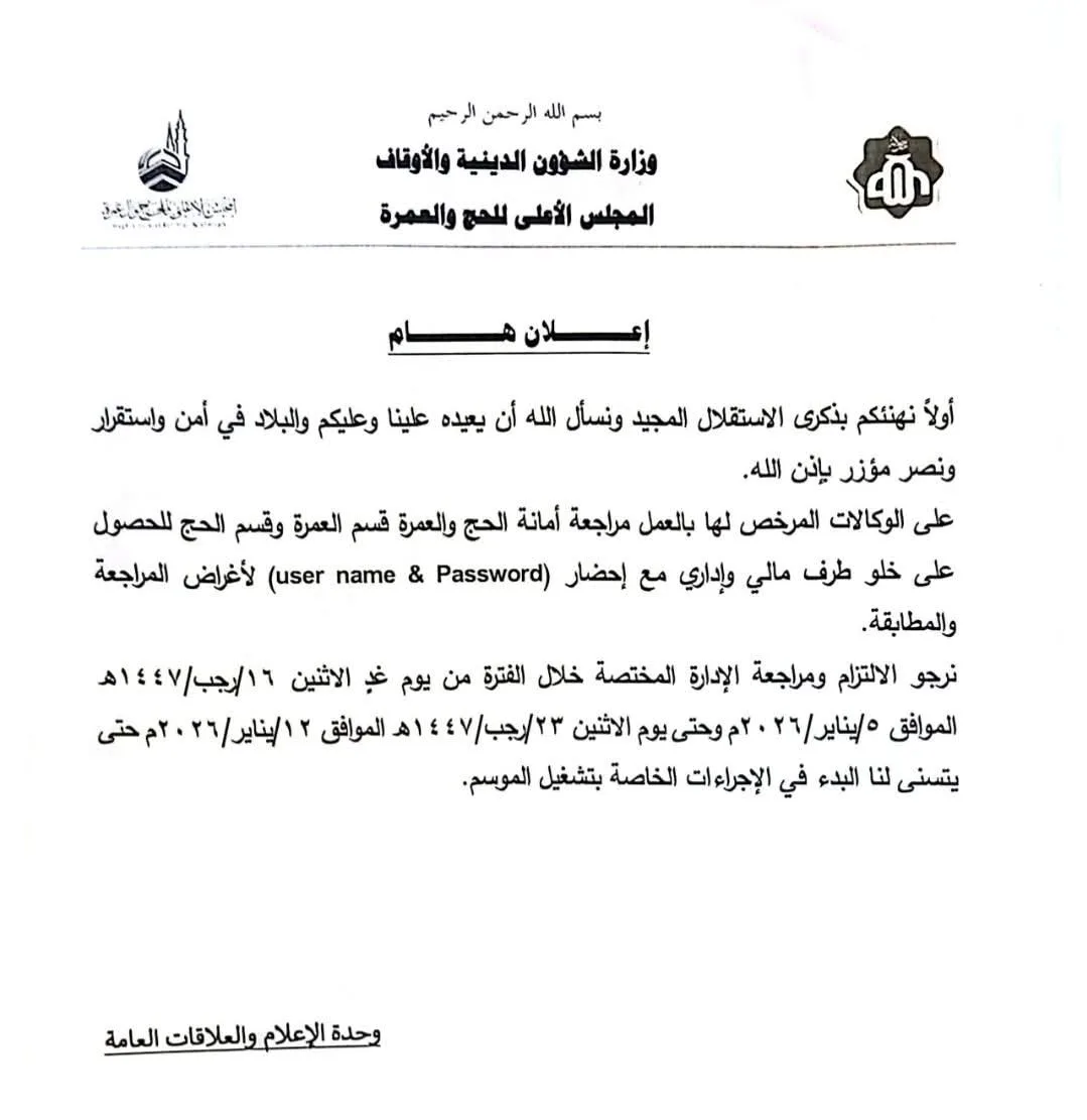 طالب المجلس الأعلي للحج والعمرة الوكالات المرخص لها بالعمل مراجعة أمانة الحج والعمرة قسم العمرة وقسم الحج للحصول على خلو طرف مالي وإداري مع إحضار (user name & password ) لأغراض المراجعة والمطابقة، ووجه المجلس الوكالات بالإلتزام ومراجعة الإدارة المختصة خلال الفترة من يوم غد الاثنين ١٦ رجب ١٤٤٧هجرية الموافق ٥ يناير ٢٠٢٦م وحتى يوم الاثنين ٢٣ رجب ١٤٤٧ هجرية الموافق ١٢ يناير ٢٠٢٦م ، حتى يتسنّى للمجلس البدء في الإجراءات الخاصة بتشغيل الموسم