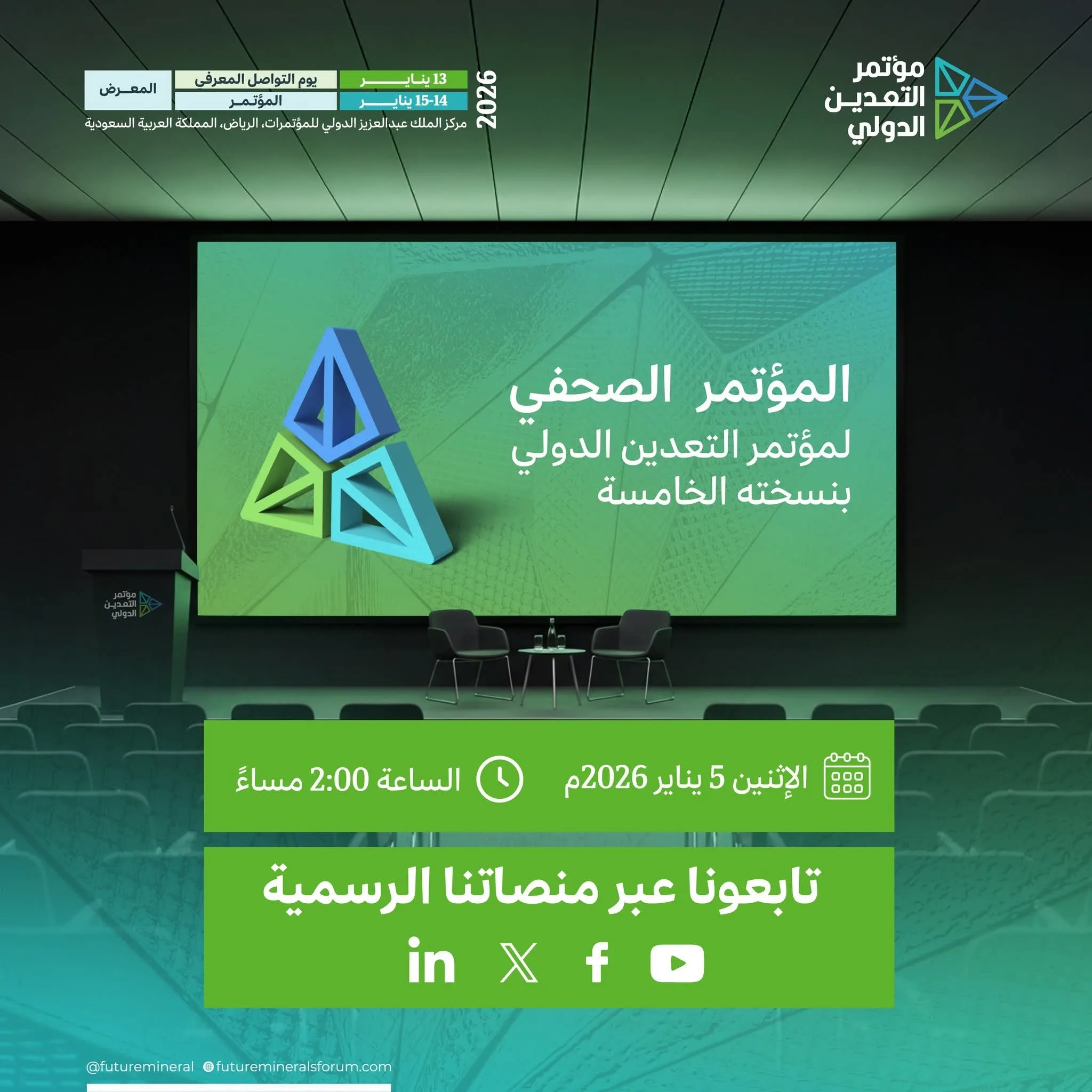 ينعقد أمسية اليوم الإثنين 5 يناير مؤتمر صحفي في العاصمة السعودية الرياض للإعلان عن تفاصيل برنامج النسخة الخامسة من مؤتمر التعدين الدولي، المنعقد خلال الفترة من 13 إلى 15 يناير الجاري، وما سوف تشتمل عليه هذه النسخة من فعاليات وما ستطرحه من مداولات ومبادرات عالمية مهمة ومؤثرة في مستقبل المعادن وتحوّل قطاع التعدين.