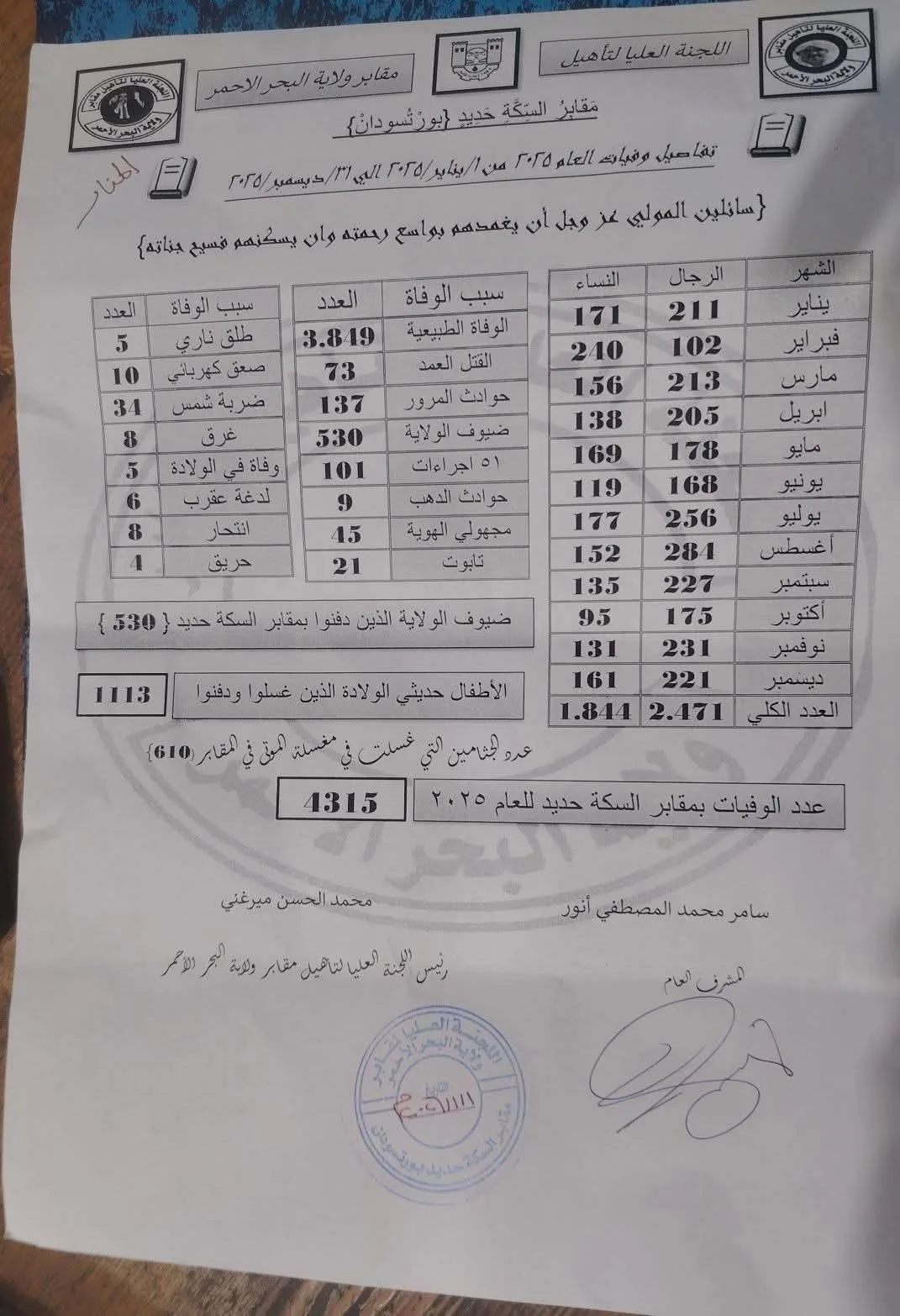 كشفت اللجنة العليا لتأهيل مقابر البحر الأحمر أن عدد الوفيات بمقابر السكة الحديد بورتسودان خلال العام الماضي بلغ 4315 حالة وفاة ، بينهم 2471 من الرجال و 1811 من العنصر النسوي فيما بلغ عدد الأطفال حديثي الولادة الذي غسلوا ودفنوا في مقابر السكة حديد ببورتسودان 1113 طفلاً، بينما بلغ عدد وفيات الضيوف الوافدين لبورتسودان ودفنوا في المقابر 530 متوفياً ، وأوضح التقرير المنشور حديثاً أن تسجيل 3819 حالة وفاة طبيعية و 137 في حوادث مرورية و 73 قتل عمد و 45 مجهولي الهوية و 31 ضربة شمس و 10 صعق كهربائي و 9 حالات وفاة في مناطق تعدين الذهب و 8 حالات إنتحار و 8 غرقاً 6 حالات وفاة بلدغة عقرب و 5 طلق ناري و 5 حالات وفيات ولادة و 4 وفيات حرقاً .