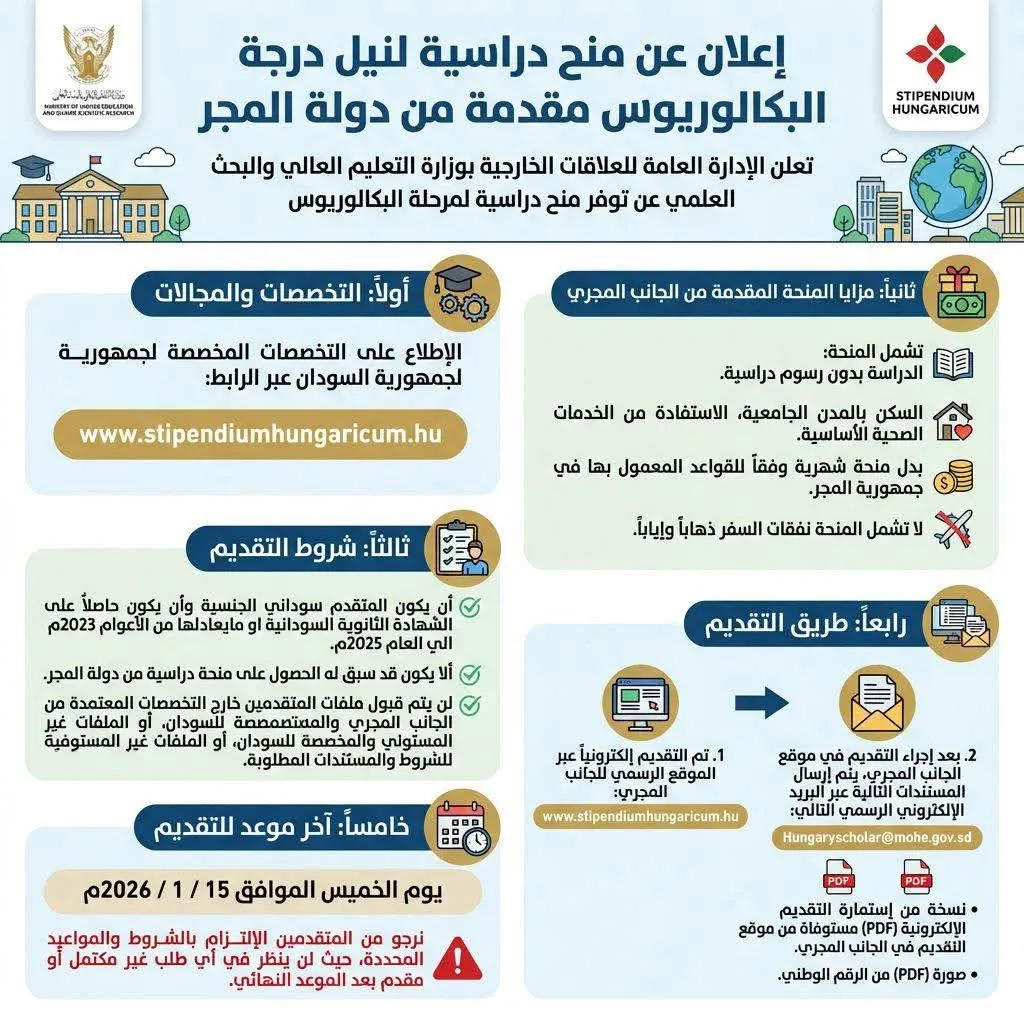 تعلن الإدارة العامة للعلاقات الخارجية بوزارة التعليم العالي والبحث العلمي عن توفر منح دراسية لمرحلة البكالوريوس مقدمة من دولة المجر، وذلك وفقاً للضوابط والشروط التالية: