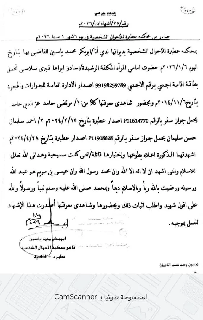 أعلنت امرأة إثيوبية مقيمة في حي المربعات بعطبرة إسلامها وذلك أمام قاضي محكمة الأحوال الشخصية في عطبرة أبوبكر محمد عثمان ، حيث نطقت بالشهادتين وأشهرت إسلامها أمام عدد من الشهود بعد تخليها عن الديانة المسيحية، وتدعي المرأة الإثيوبية التي أعلنت إسلامها أسادو أبراها قبري سلاسي وهي مقيمة في عطبرة منذ أكثر من 35 عاماً.