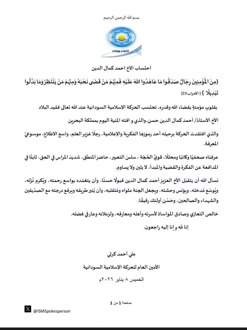 بقلوبٍ مؤمنةٍ بقضاء الله وقدره، تحتسب الحركة الإسلامية السودانية عند الله تعالى فقيد البلاد