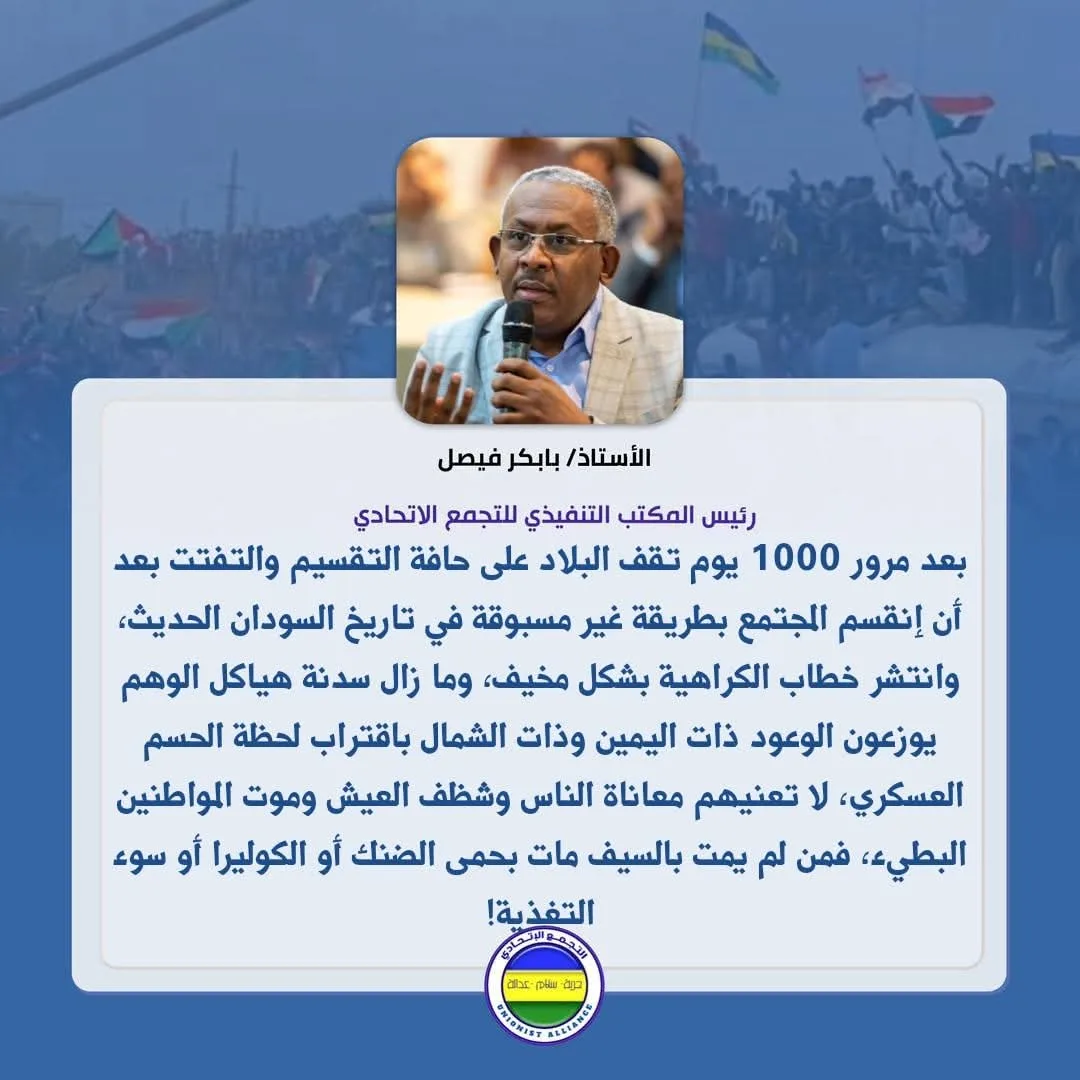 – بعد مرور 1000 يوم تقف البلاد على حافة التقسيم والتفتت بعد أن إنقسم المجتمع بطريقة غير مسبوقة في تاريخ السودان الحديث, وانتشر خطاب الكراهية بشكل مخيف, وما زال سدنة هياكل الوهم يوزعون الوعود ذات اليمين وذات الشمال باقتراب لحظة الحسم العسكري, لا تعنيهم معاناة الناس وشظف العيش وموت المواطنين البطيء, فمن لم يمت بالسيف مات بحمى الضنك أو الكوليرا أو سوء التغذية!