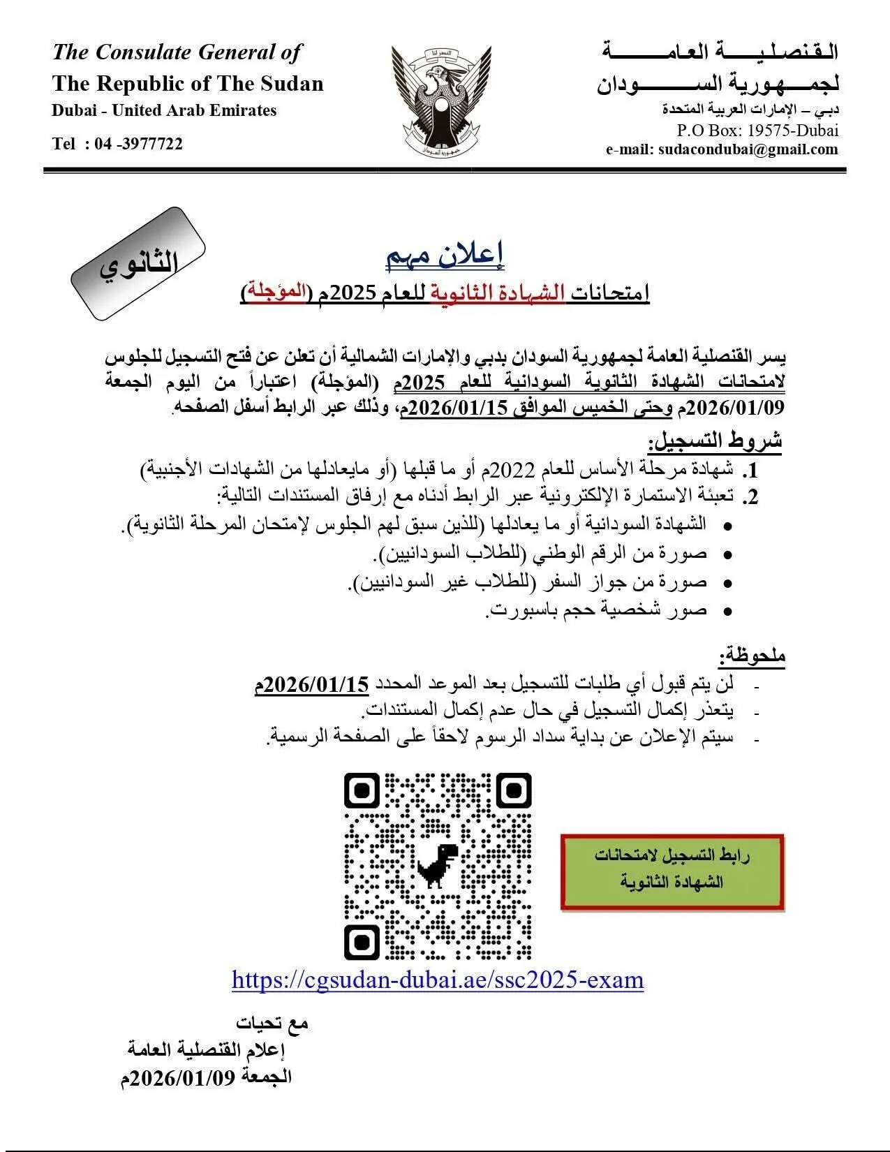 أعلنت القنصلية السودانية في دبي عن بدء إجراءات التسجيل للجلوس لإمتحانات الشهادة الثانوية للعام 2025م (المؤجلة) اعتباراً من يوم أمس الجمعة 2026/01/09م وحتى الخميس الموافق 2026/01/15م، وذلك عبر الرابط أسفل الصفحة ووفقاً لشروطالتسجيل :