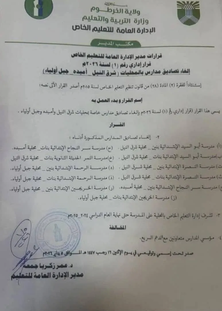 أعلنت لجنة المعلمين السودانيين رفضها لقرار إلغاء تصديق مدارس بولاية الخرطوم تحت ذريعة مولاة مؤسسيها للدعم السريع وقالت اللجنة في بيان لها تابعت بقلق بالغ القرار الصادر مؤخرًا والقاضي بإلغاء تصاديق عدد من المدارس في مناطق شرق النيل، جبل أولياء، وأمبدة بولاية الخرطوم، وذلك على خلفية اتهامات وُجهت لمؤسسي تلك المدارس بالتعاون مع قوات الدعم السريع، دون تقديم أي أدلة موثقة أو إجراءات قانونية شفافة تضمن حق الدفاع والمحاكمة العادلة، وأكدت اللجنة رفضها القاطع لأي قرارات تعسفية تمس المؤسسات التعليمية دون سند قانوني واضح أو إجراءات قضائية عادلة ، محذرة من خطورة تسييس التعليم والزج بالمؤسسات التربوية في أتون الصراع السياسي والعسكري، لما لذلك من آثار مدمرة على مستقبل الأجيال، واستنكرت الإتجاه لعسكرة العملية التعليمية، ومحاولات فرض الوصاية الأمنية على المدارس والمعلمين والطلاب ، وطالبت اللجنة الجهات المعنية بالكشف عن الأسس القانونية التي استندت إليها هذه القرارات، وتمكين المتضررين من حقهم في الطعن والتقاضي ، ودعت اللجنة لحماية حقوق الطلاب والمعلمين في تلك المدارس، وضمان عدم تشريدهم أو حرمانهم من التعليم والعمل، تحت أي ذريعة ، وأكدت أن التعليم يجب أن يظل فضاءً محايدًا وآمنًا ، لا يُستخدم كأداة للانتقام أو التصنيف السياسي. ونؤكد أن استقرار العملية التعليمية هو ركيزة أساسية لبناء السلام والعدالة في السودان.