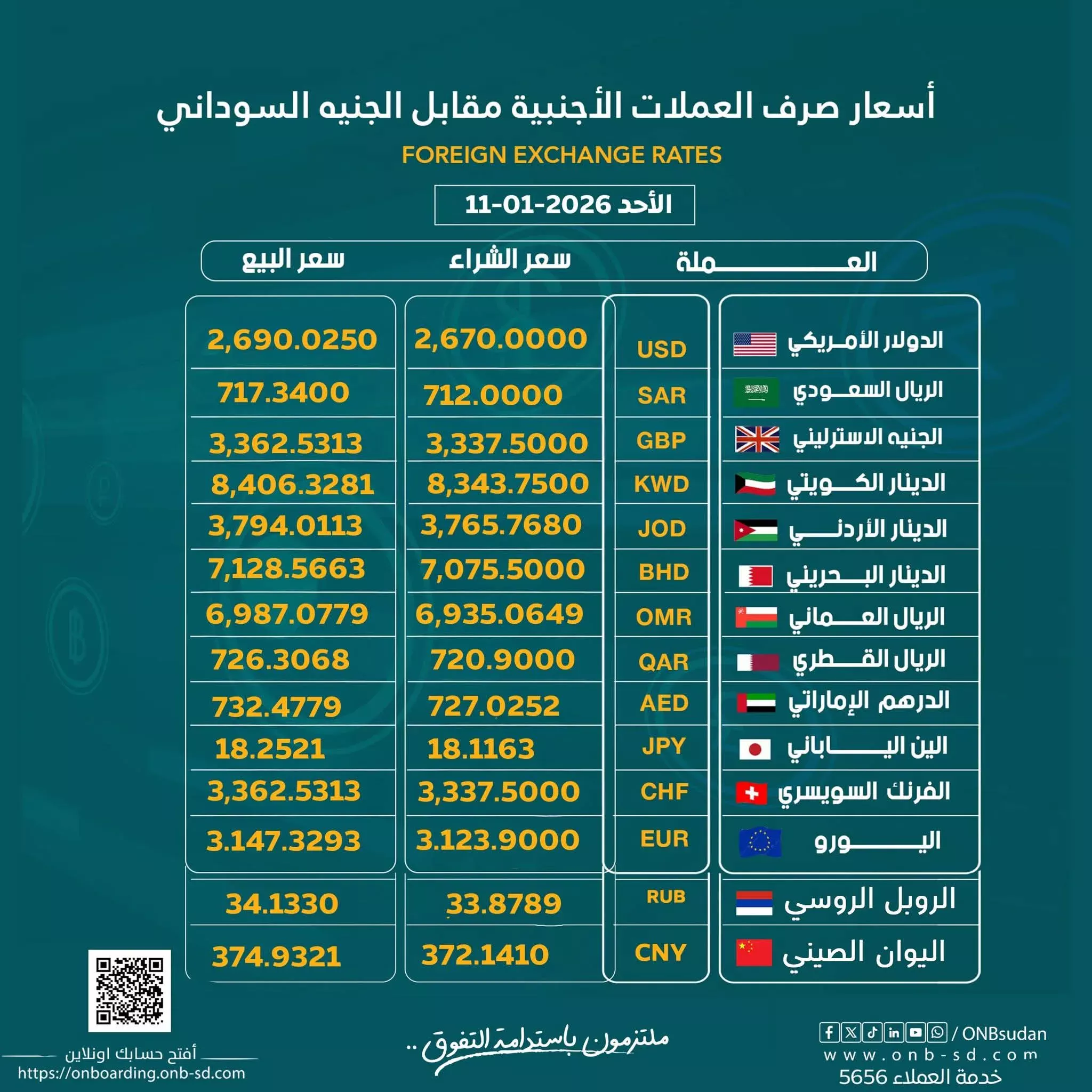 نشرة #أسعار_العملات الأجنبية مقابل الجنيه السوداني من #بنك_أمدرمان_الوطني ليوم الأحد 11 يناير 2026 م