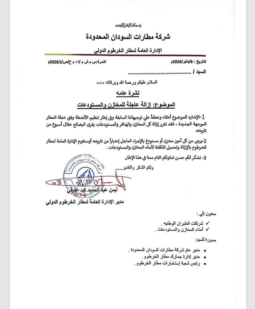 أصدر المدير العام لمطار الخرطوم أيمن عفيفي أمر لشركات ووكلاء شركات الكارقو بمطار الخرطوم بنقل وإزالة المستودعات والمخازن شمال صالة الحج و العمرة وجنوب مستودع سودانير في مدة اقصاها اسبوع .