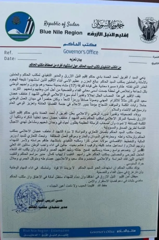 ▪️ينعى السيد الفريق أحمد العمدة بادي حاكم إقليم النيل الأزرق والمدير التنفيذي لمكتب الحاكم و العاملين بالامانة والعاملين بمكتب السيد الحاكم ، ببالغ الحزن وعظيم الأسى، أبناء الإقليم والوطن الذين إستشهدوا نتيجة الهجوم الغادر الذي نفذته طائرة مسيرة معادية علي قيادة الفرقة (17) مشاة بمدينة سنجة، وهم يؤدّون واجبهم الوطني بكل شجاعة وإخلاص، في لحظةٍ جسّدت أسمى معاني الفداء و التضحية من أجل أمن وطنهم و شعبهم الكريم.