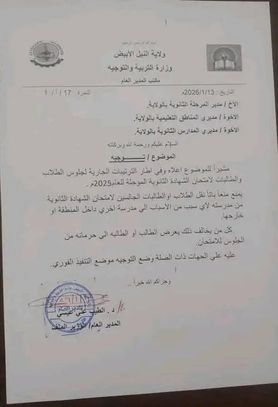 أصدرت وزارة التربية والتوجيه بولاية النيل الأبيض توجيهًا رسميًا إلى إدارة المرحلة الثانوية، ومديري المناطق التعليمية، ومديري المدارس الثانوية، يقضي بعدم نقل أي طالب أو طالبة من الجالسين لامتحانات الشهادة الثانوية المؤجلة للعام 2025م إلى أي مدرسة أخرى، سواء داخل المنطقة التعليمية أو خارجها ، وأكدت الوزارة أن هذا التوجيه ملزم ويمنع منعًا باتًا، مشددة على أن أي مخالفة له ستترتب عليها حرمان الطالب أو الطالبة من الجلوس للامتحان، مع تحميل الجهات المخالفة كامل المسؤولية القانونية والإدارية.