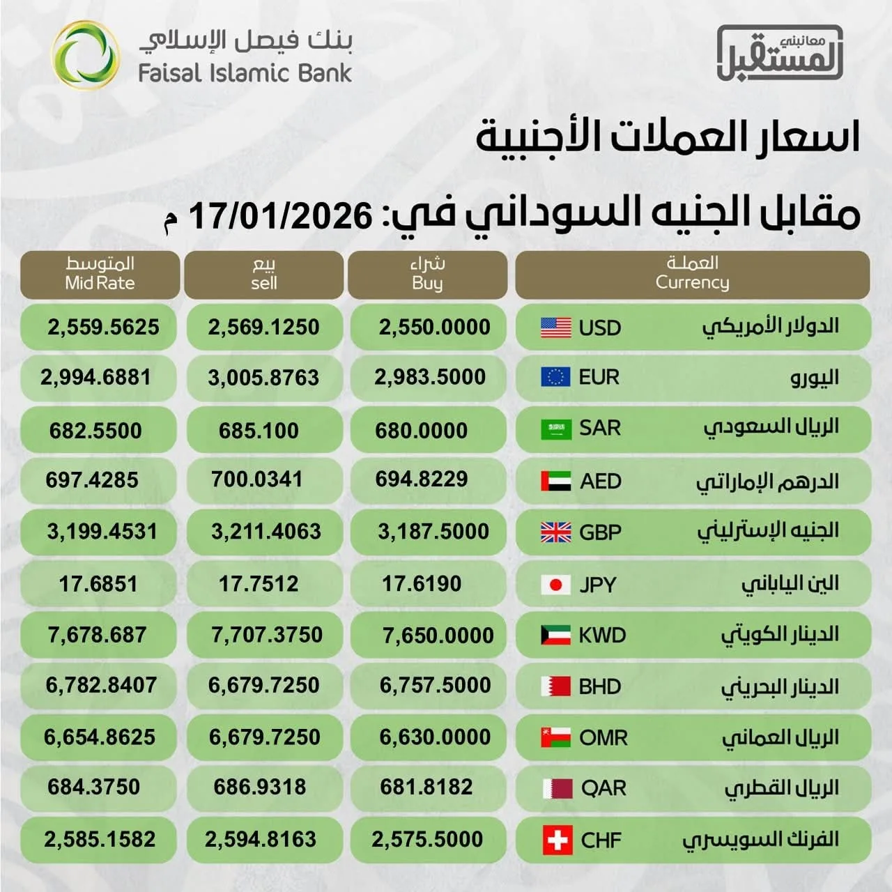 أسعار الصرف للعملات الاجنبية مقابل الجنيه السوداني في بنك فيصل الإسلامي اليوم السبت 17 يناير