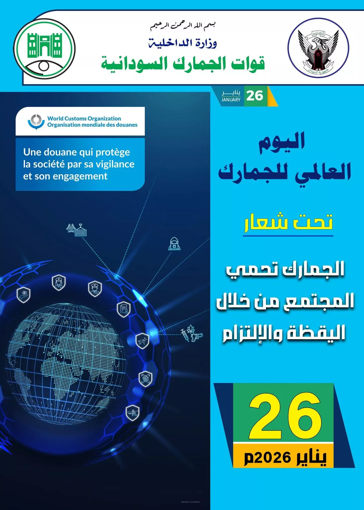 تستعد قوات الجمارك السودانية للاحتفال بـ يوم الجمارك العالمي الذي يصادف 26 يناير من كل عام، والذي يأتي هذا العام تحت شعار (الجمارك تحمي المجتمع من خلال اليقظة والالتزام) وقالت هيئة الجمارك إن الاحتفالٌ بيوم الجمارك العالمي يجسّد مسيرة عطاءٍ وتضحيات، ويعكس الدور الوطني الكبير الذي ظلت تضطلع به قوات الجمارك في حماية الاقتصاد الوطني، وتأمين المجتمع، ومكافحة التهريب والجريمة العابرة للحدود، وذلك رغم التحديات الاستثنائية التي فرضتها ظروف الحرب، حيث واصلت أداء واجبها بكل يقظة، وانضباط، والتزام ، مؤكدة أن يوم الجمارك العالمي ليس مجرد مناسبة احتفالية، بل هو محطة لتجديد العهد بمواصلة العمل بإخلاص، وتعزيز قيم المهنية، وترسيخ الشراكة مع المجتمع، تأكيداً على أن الجمارك كانت وستظل خط الدفاع الأول لحماية الوطن والمواطن.