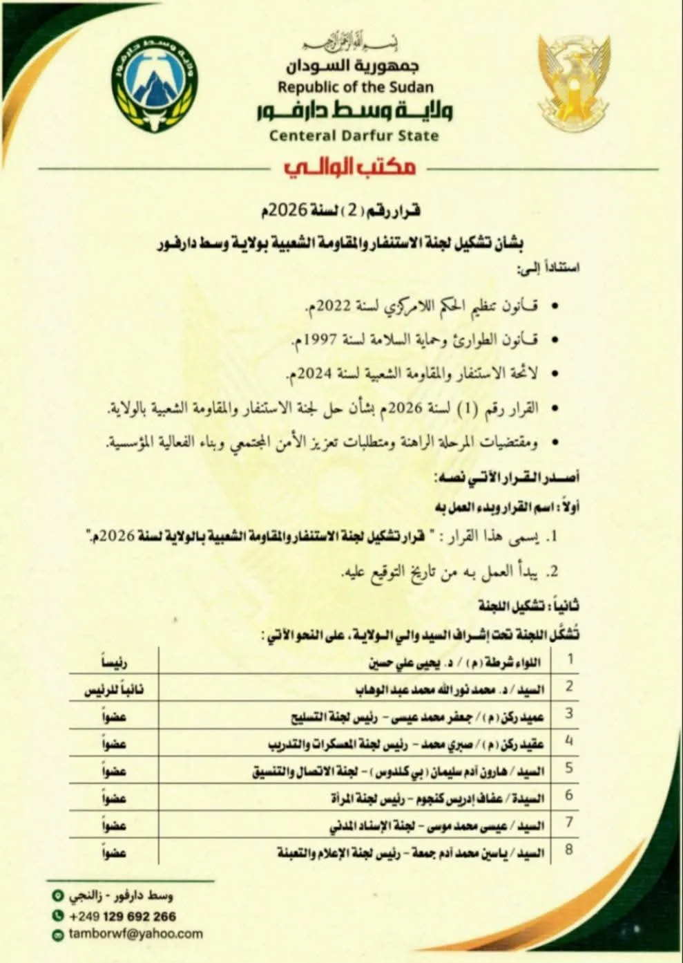 أصدر والي ولاية وسط دارفور مصطفي تمبور قراراً بتشكيل لجنة الإستنفار والمقاومة الشعبية بولاية وسط دارفور، وسمّي القرار اللواء شرطة دكتور يحيي علي حسين رئيساً ومحمد نور الله عبد الوهاب نائباً للرئيس وعضوية آخرين وتتولي اللجنة وفقاً للقرار عدداً من المهام من بينها تخطيط وتنفيذ برامج التعبئة والإستنفار بالتنسيق مع لجنة أمن الولاية وتسليح المستنفرين تحت إشراف الجيش مع عمليات حصر المستنفرين واستقطاب الدعم المالي وترتيب وتنظيم برامج ومناطق المقاومة الشعبية علي مستوي الولاية والمحليات.