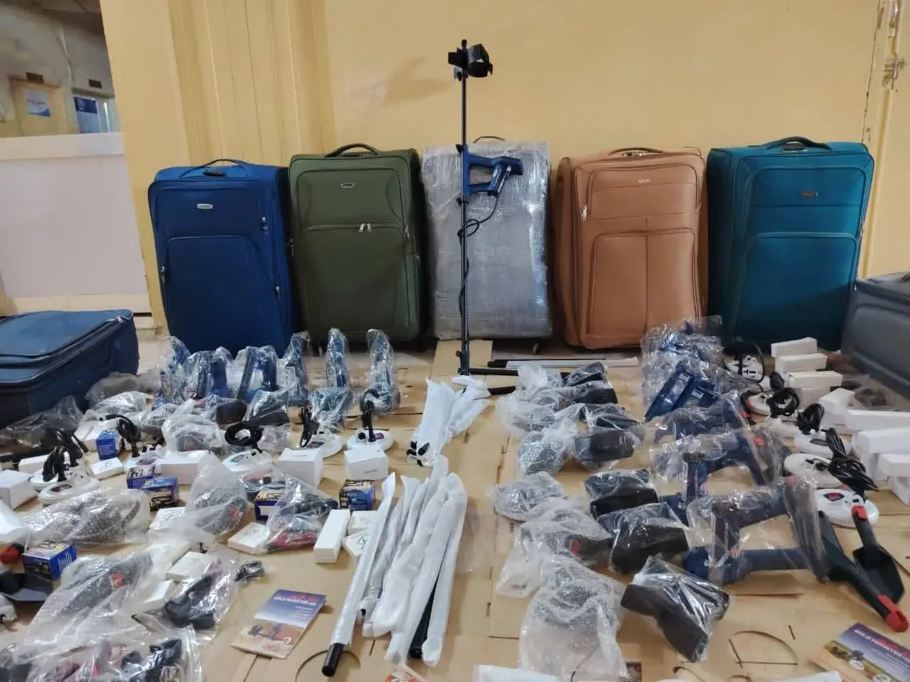 وعلي ضوء ذلك تم تنفيذ عملية مداهمة نوعية للمنزل مثار المعلومة أسفرت عن ضبط المتهم (م، ب) وبحوزته (7) حقائب بداخلها (65)جهاز كشف ذهب أمريكي وجهاز جي بي اس تقدر قيمتها بـ(500) مليون.