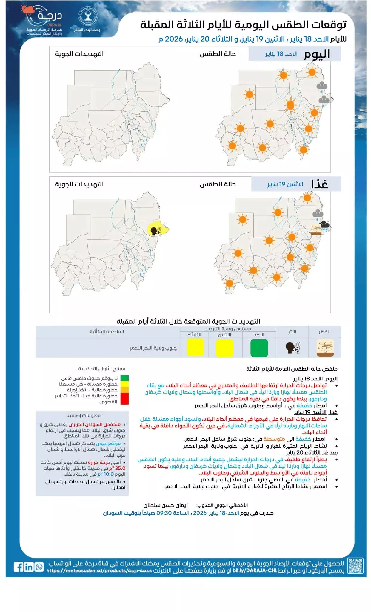 أصدرت الهيئة العامة للأرصاد الجوية نشرة أحوال الطقس وتوقعات الأجواء مساء اليوم الأحد 18 يناير والأيام القادمة، وتوقعت الهيئة بقاء الطقس باردًا ليلًا في شمال البلاد وأواسطها وشمال ولايات كردفان ودارفور، بينما يكون دافئًا في بقية المناطق مع هطول امطار خفيفة في أواسط وجنوب شرق ساحل البحر الاحمر، فيما تحافظ درجات الحرارة على معدلاتها في معظم أنحاء البلاد يوم غد الإثنين 19 يناير ، وتسود أجواء معتدلة خلال ساعات النهار وباردة ليلًا في الأجزاء الشمالية، في حين تكون الأجواء دافئة في بقية أنحاء البلاد ، مع وتوقعات بهطول امطار خفيفة الي متوسطة في جنوب شرق ساحل البحر الاحمر ونشاط الرياح الشمالية الشرقية المثيرة للغبار والاتربة في جنوب ولاية البحر الاحمر، وفي يوم الثلاثاء 20 يناير يطرأ ارتفاع طفيف في درجات الحرارة ليشمل جميع أنحاء البلاد، وعليه يكون الطقس معتدلًا نهارًا وباردًا ليلًا في شمال البلاد وشمال ولايات كردفان ودارفور، بينما تسود أجواء دافئة في الأواسط والجنوب الشرقي وجنوب البلاد ، مع هطول امطار خفيفة في اقصي جنوب شرق ساحل البحر الاحمر واستمرار نشاط الرياح الشمالية الشرقية المثيرة للغبار والاتربة في جنوب ولاية البحر الاحمر.