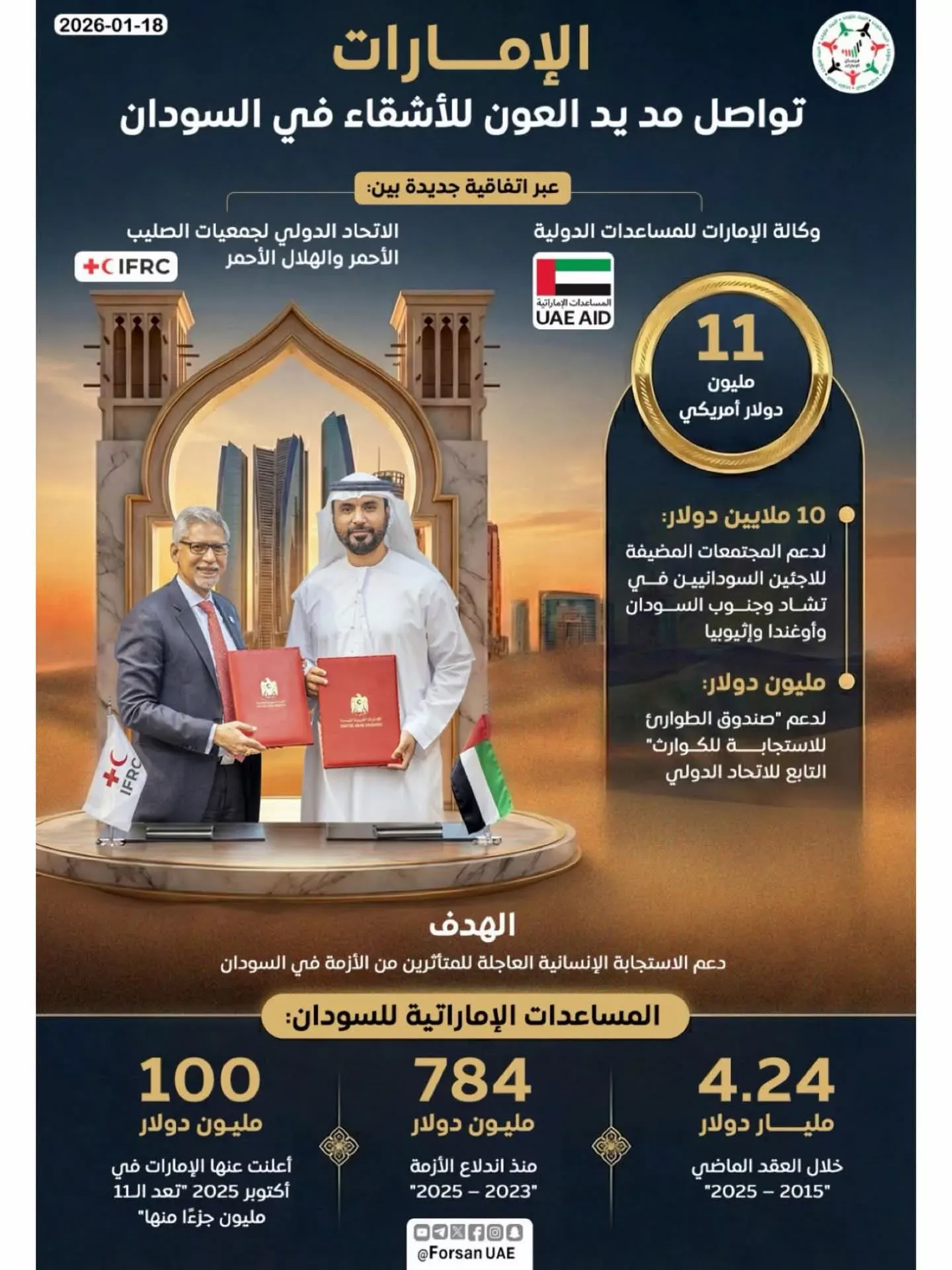 أعلنت الإمارات‬⁩ عن مواصلة مدّ يد العون للسودانيين المتأثرين بالحرب وقالت أنها وقعت اتفاقية جديدة بين وكالة الإمارات للمساعدات الدولية والاتحاد الدولي لجمعيات الصليب الأحمر والهلال الأحمر بقيمة 11 مليون دولار لدعم الاستجابة الإنسانية العاجلة للمتأثرين من الأزمة في السودان.