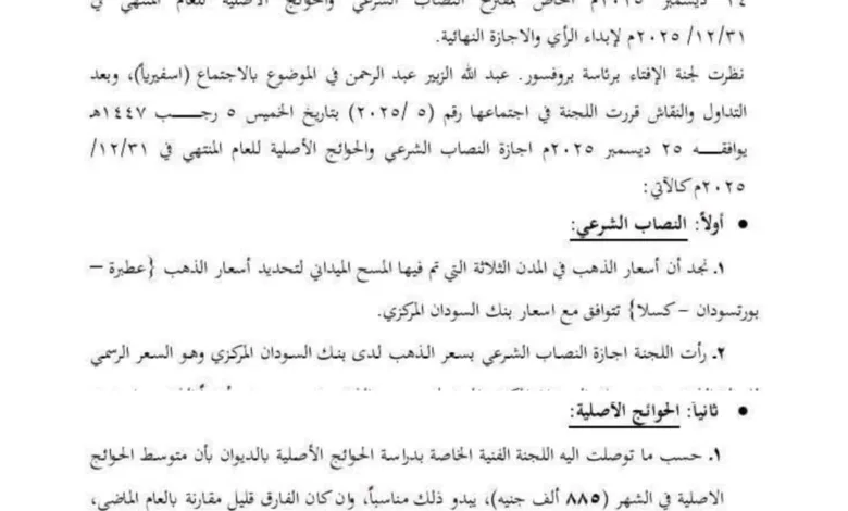 ديوان الزكاة : النصاب الشرعي للزكاة ( ٣٥,٧٠٠,٠٠٠) جنيهاً