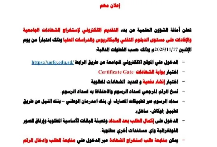 جامعة الجزيرة تعلن عن فتح باب التسجيل لإستخراج الشهادات الجامعية