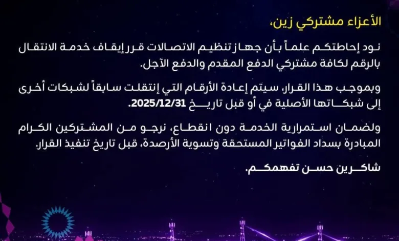 أعلنت شركة زين للإتصالات عن إيقاف خدمة الإنتقال بالرقم لجميع مشتركي الدفع المقدم والدفع الآجل، وقالت زين إن القرار جاء…