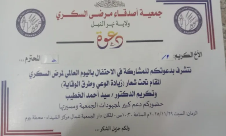 تنظم جمعية اصدقاء مرض السكري احتفالاً باليوم العالمي لمرض السكري المقام تحت شعار “زيادة الوعي وطرق الوقاية” وتكريم الدكتور سيد…
