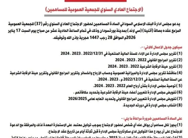 البنك الإسلامي السوداني يحدد 17 يناير موعداً لإنعقاد إجتماع الجمعية العمومية للمساهمين