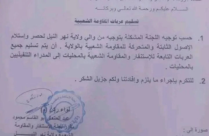المقاومة الشعبية بولاية نهر النيل تشرع في تسليم العُهد والأصول والسيارات