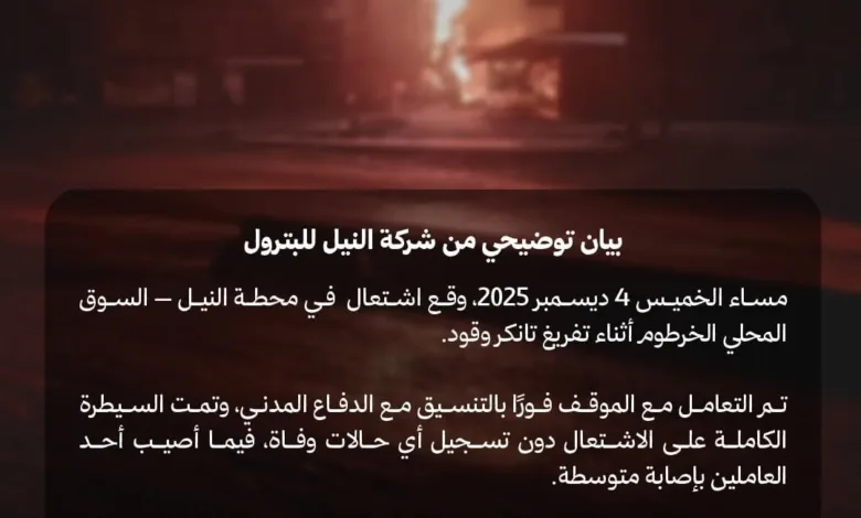 شركة النيل للبترول توضح ملابسات حادثة إشتعال محطتها بالسوق المحلي