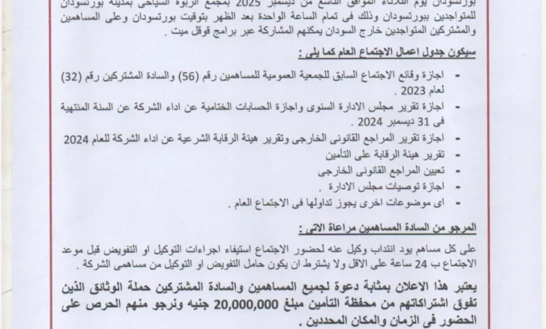 الشركة السودانية للتأمين تعقد إجتماع الجمعية العمومية في 9 ديسمبر ببورتسودان