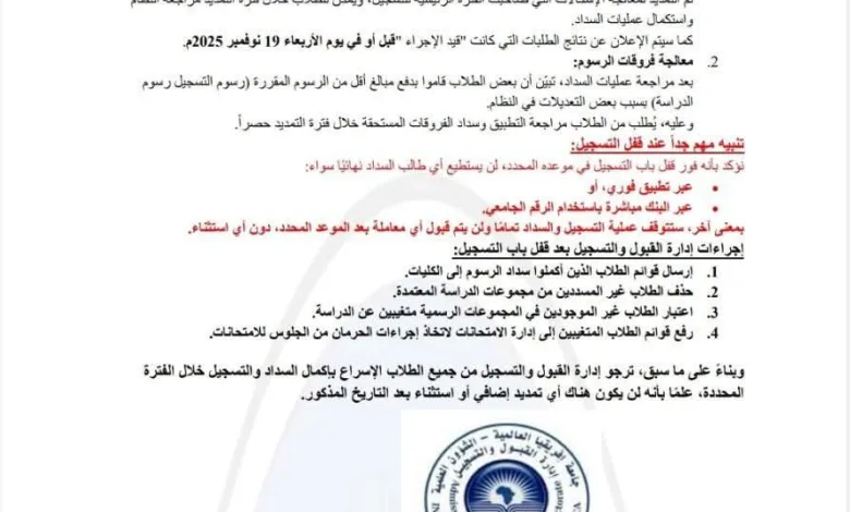 أعلنت جامعة إفريقيا العالمية عن تمديد فترة إجراءات تسجيل الطلاب الجدد المرشحين لجامعة إفريقيا العالمية – الدفعة المؤجلة (2023) م…
