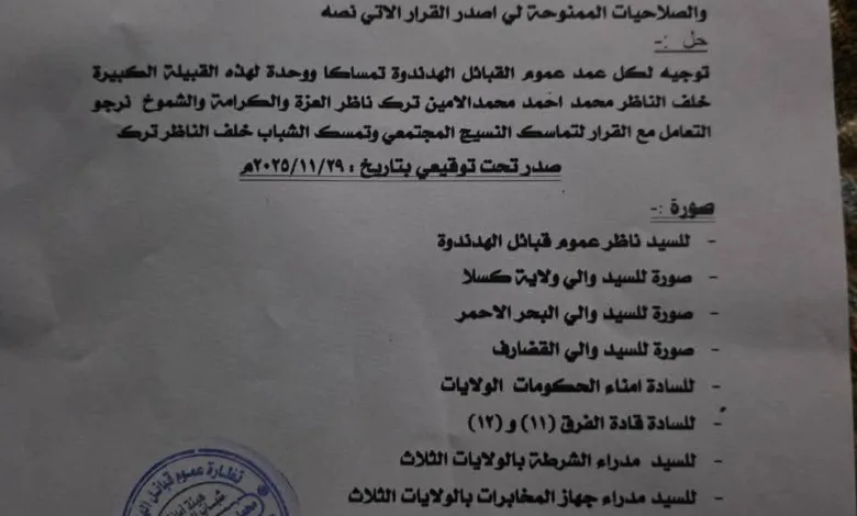 أصدرت أمانة شباب الهدندوة قراراً بحل جميع الامناء بقبائل الهدندوة والتمسك بأمناء الولايات والمحليات بالبحر الأحمر، كسلا والقضارف.