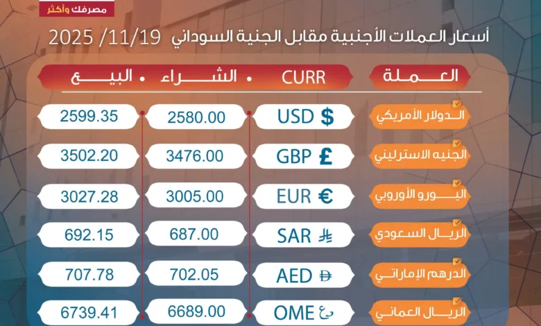 نشرة أسعار الصرف للعملات الأجنبية مقابل الجنيه السوداني من بنك النيل اليوم الاربعاء 19 نوفمبر 2025م