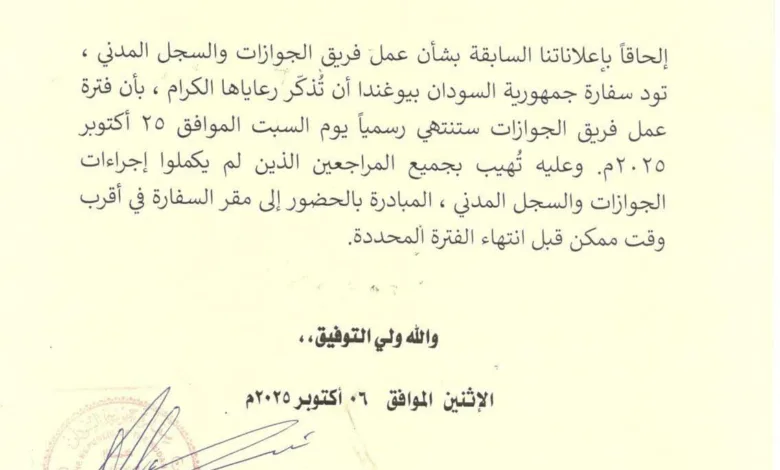 أوضحت مصادر مطلعة في كمبالا عدم وجود معاملات قنصلية تتعلق بإجراءات إستخراج أو تجديد جوازات الرعايا السودانيين في السفارة…