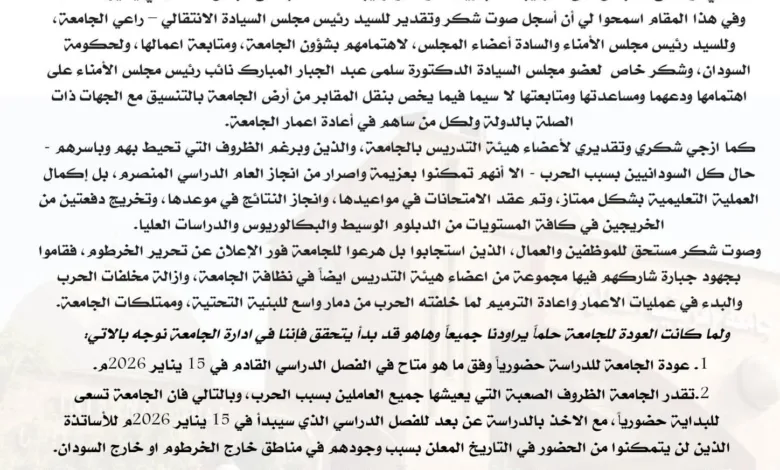أعلنت جامعة إفريقيا العالمية عودتها للدراسة حضورياً من مقرها بالخرطوم إعتباراً من 15 يناير المقبل وفق ما هو في الفصل…