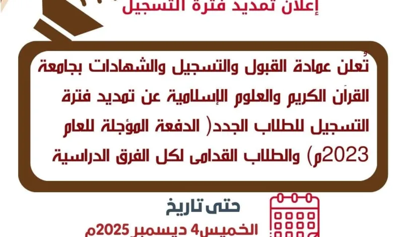 أعلنت جامعة القرآن الكريم والعلوم الإسلامية عن تمديد فترة التسجيل للطلاب الجدد الدفعة المؤجلة للعام 2023م والطلاب القدامى لكل الفرق…