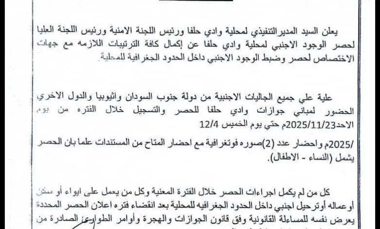 أعلنت السلطات المحلية بوادي حلفا عن إكتمال الترتيبات الخاصة بحصر وتسجيل الأجانب ودعت لجنة حصر الوجود الأجنبي الوافدين من جنوب…