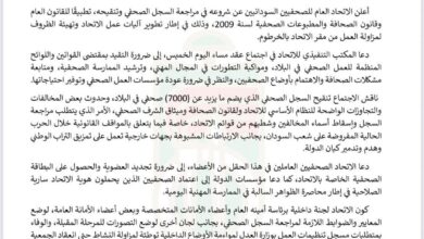 أعلن الاتحاد العام للصحفيين السودانيين عن بدء عملية مراجعة وتنقيح السجل الصحفي، في خطوة قال إنها تأتي تنفيذاً لأحكام القانون…