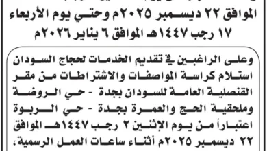 مكتب شؤون حجاج السودان يعلن عن بداية التقديم لحزم الخدمات للعام ١٤٤٧ هـ عبر كافة الوسائط والصحف بالسعودية